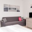 Appartamento accogliente e ben arredato, ideale per un soggiorno confortevole in ogni stagione. L’ingresso introduce a una luminosa cucina completamente attrezzata, dotata di aria condizionata e riscaldamento, per garantire il massimo comfort sia nei mesi estivi che in quelli invernali. Accanto alla cucina si trova un comodo divano letto, perfetto per ospiti aggiuntivi o momenti di relax.