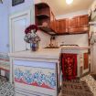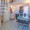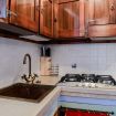 Nel salotto si trovano due divani e il televisore. La cucina è fornita di tutto il necessario per cucinare: oltre ai fornelli a gas sono presenti un forno tradizionale e un forno microonde, bollitore, macchina del caffè Moka ed espresso, tostapane, frigorifero, oltre alla lavasciuga. Sopra alla cucina, accessibile da una piccola scala a chiocciola, si trova all'interno di uno spazio soppalcato un ulteriore letto singolo. A completare l'appartamento un piccolo bagno fornito di doccia, WC e asciugacapelli.
